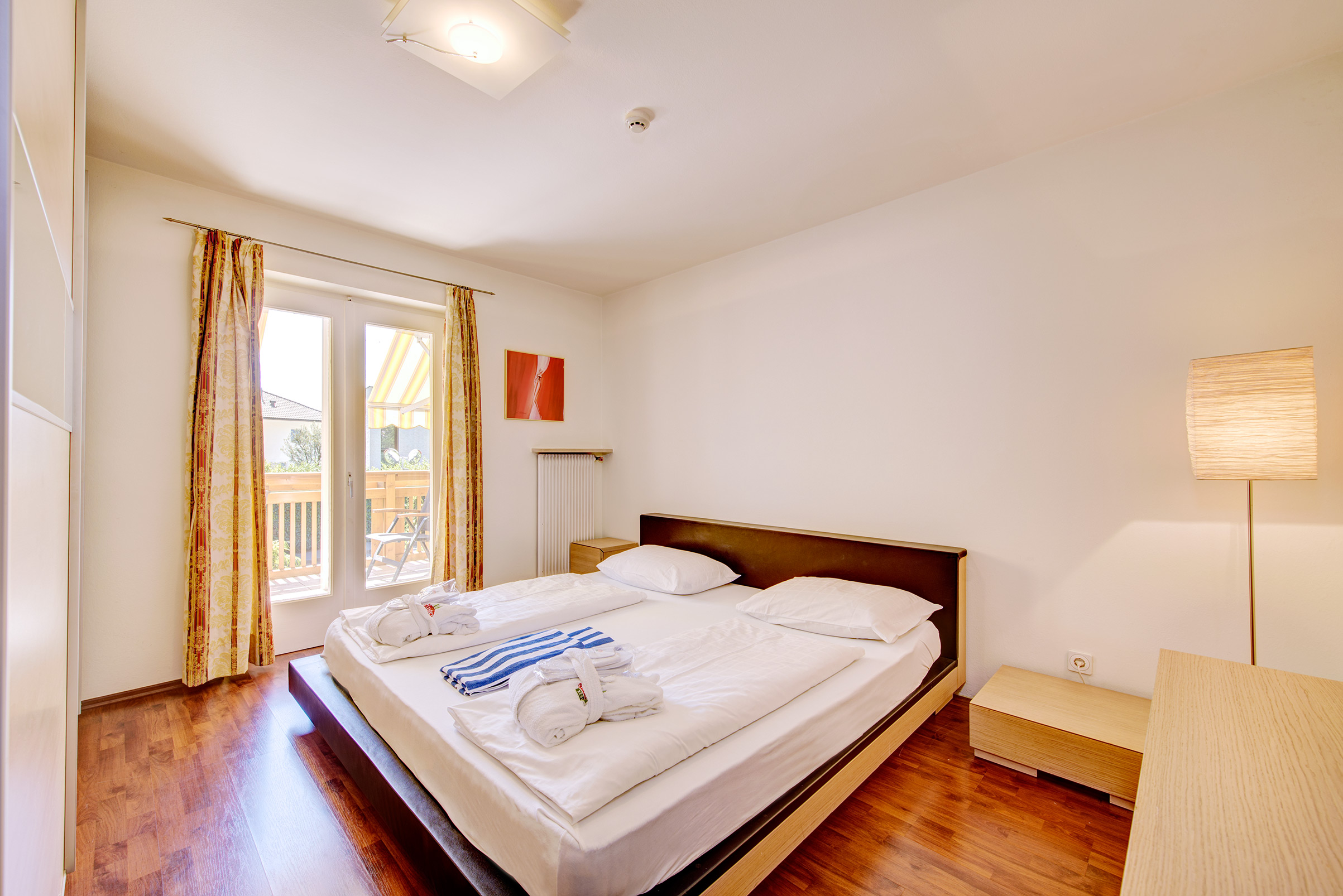 Südbalkon, Wohnzimmer mit Ledersofa, modernes Schlafzimmer, zweites Doppelzimmer, Wohnküche, Badezimmer mit Dusche/WC, Klimaanlage, SAT-TV, Safe, im Livehotel Friedheim. Dieses Zimmer bietet Platz für maximal 4 Personen. Gerne stellen wir Ihnen zusätzlich auf Anfrage ein Bett für Ihr Kleinkind (0-2 Jahre) gegen einen Aufpreis von 10,-€ zur Verfügung. |