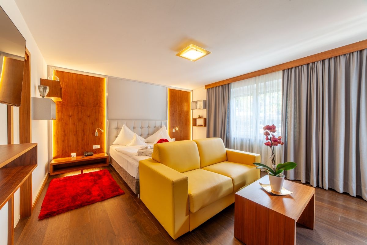 | Rosensuite, 80 m², 1 getäfelte Stube in Nussholz 26m², Schlafzimmer 22m², Ledercouch, 12 m² Badzimmer mit Hydromassagewanne u. BioSauna, Geberit Acqua Clean Sela (Dusch-WC), Fußbodenheizung in Bad und Schlafzimmer, Klimaanlage, 2 Balkone, Sonnenmarkise, direkter Blick auf das Etschtal, bei Bedarf auch mit voll ausgestattete Küche 14m² verwendbar. Max 2 Erwachsene und zwei Kinder bis 16 Jahre. |