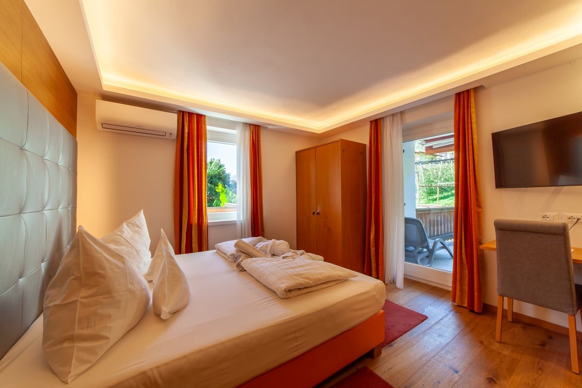 Modernes Doppelzimmer "Typ Superior 2" in der Pension Schönblick***, Neurenovierung 2018, mit Holzfußboden, Deckenbeleuchtung, Balkon mit Blick auf Meran und das Etschtal oder die Gartenanlage und das alte Dorf, neue Badeinrichtung, neue Möblierung, Dusche/WC, Flachbildschirm 26 Zoll HD Qualität, Whirless Lan Verbindung, Telefon und Safe. NEU ab 2024 mit Klimaanlage Dieses Zimmer bietet Platz für maximal 2 Personen. Gerne stellen wir Ihnen zusätzlich auf Anfrage ein Bett für Ihr Kleinkind (0-2 Jahre) gegen einen Aufpreis von 10,-€ zur Verfügung. |